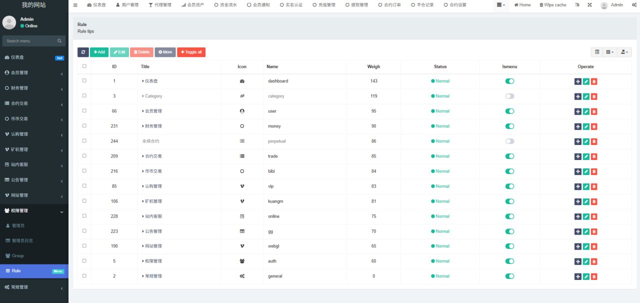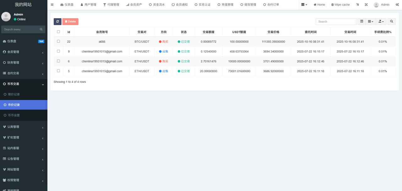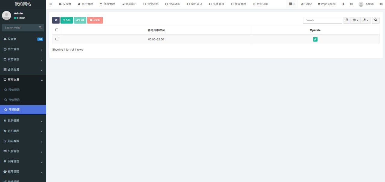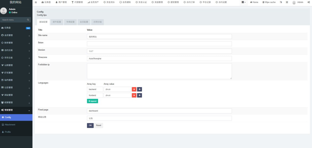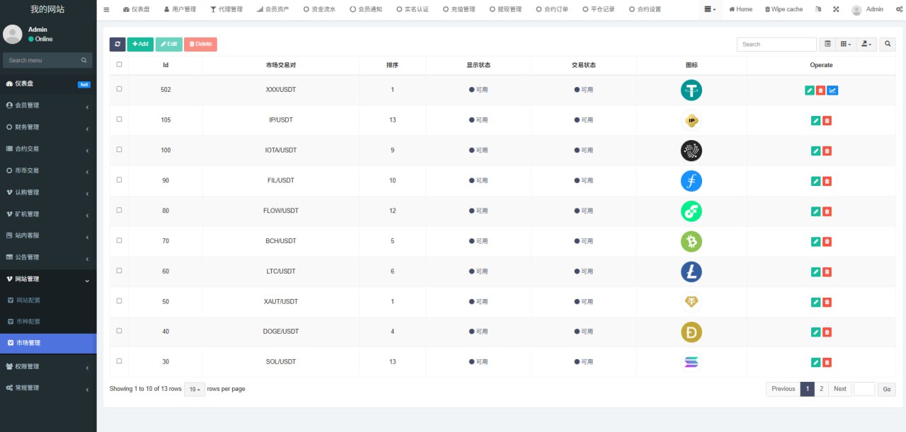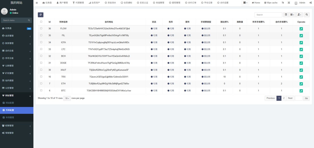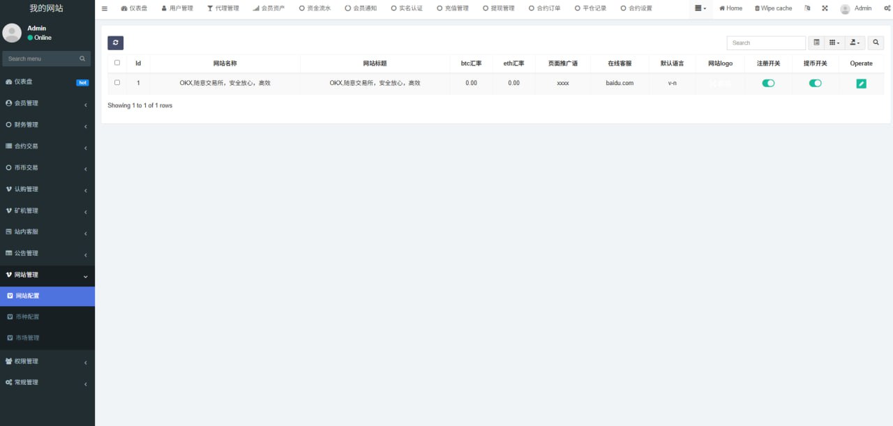 1.网站管理(网站名称 网站logo 客服链接 币种市场 币种配置)