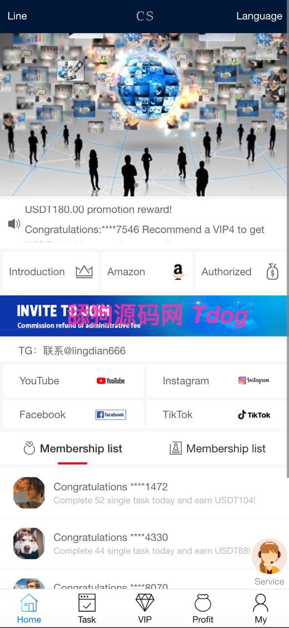 会员购买套餐升级、领取任务,提交截图上传审核、后台审核任务完成情况,给会员确认佣金、会员得到佣金后自行提现、会员可分享链接邀请好友注册将获得提成、国际多语言(支持定制增加语言和二次开发)